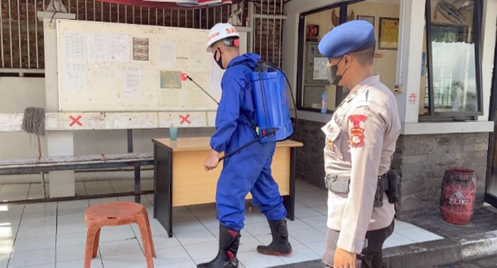 Brimob Siaga Covid-19, Bataliyon A Pelopor Semprotkan Disinfektan di Wilayah Kabupaten Garut