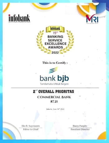 bank bjb meraih peringkat ke-2 dalam kategori Overall Prioritas kelompok Bank Umum Konvensional. Hal ini berdasarkan hasil kualitas pelayanan direct dan in-direct pada tahun 2021 yang telah dikaji secara independen oleh Biro Riset Infobank (BiRI).