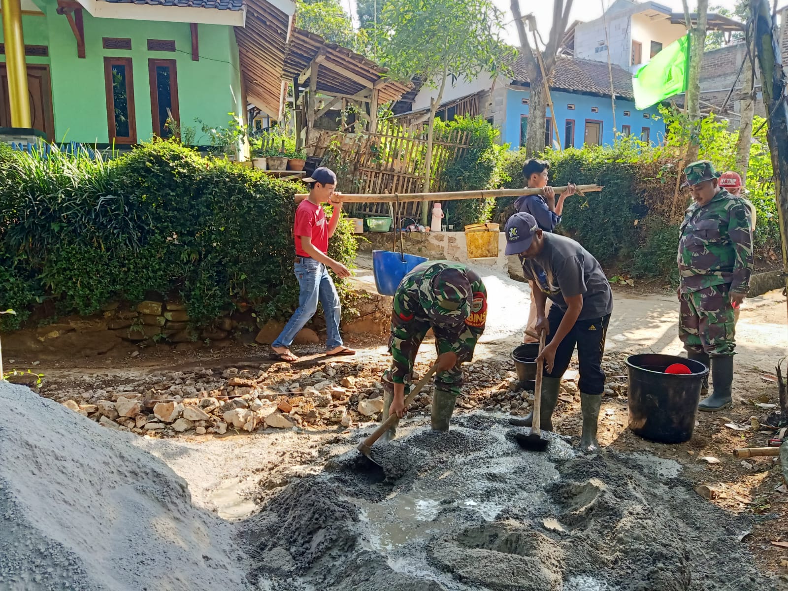 Anggota Koramil 1014/Cimanggung Bersama Warga Bergotong Royong Melakukan Pengecoran Jalan Gang Lebak Lewang