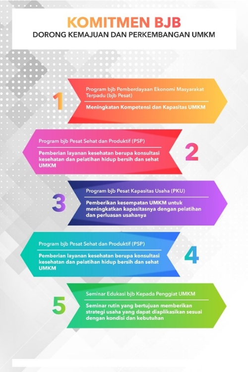 Wujud nyata dukungan penuh terhadap UMKM oleh bank bjb dapat terlihat dariprogram bjb Pesat alias program Pemberdayaan Ekonomi Masyarakat Terpadu. Program yang diluncurkan pada 2015 ini ditujukan untuk meningkatkan kompetensidan kapasitas usaha bagi pelaku usaha. Dengan harapan bukan saja memberikanpermodalan melainkan juga pendampingan agar UMKM semakin maju dan berkembang.