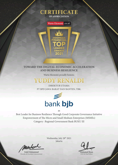 BANDUNG, eljabar.com – bank bjb kembali menorehkan pencapaian prestisius di pertengahan tahun 2021 ini dengan menerima penghargaan Best Leader for Business Resilience Through Good Corporate Governance Initiative – Empowerment of The Micro and Small Medium Enterprises (MSMEs), Kategori Bank BUKU III, BPD.