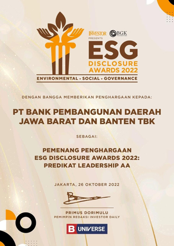 Penghargaan tersebut diterima oleh Direktur Utama bank bjb Yuddy Renaldi pada acara Pengumuman ESG Disclosure Awards 2022 yang diadakan oleh Majalah Investor bekerjasama dengan Bumi Global Karbon Foundation, Rabu 26 Oktober 2022.