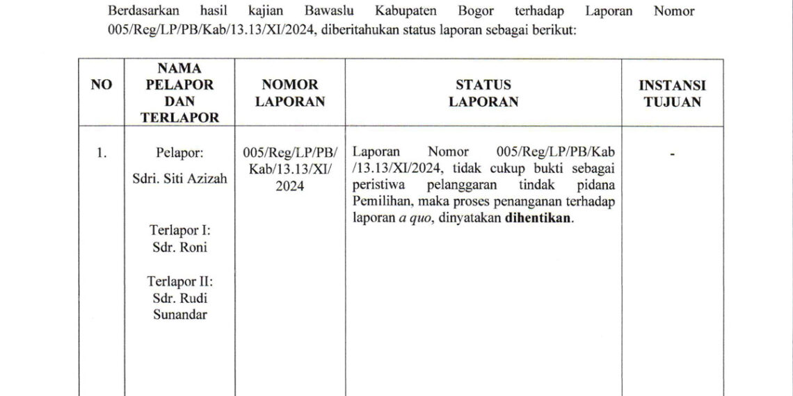 “Pelakunya sudah mengakui kesalahan, laporan sudah kita buat berikut bukti dan saksi-saksi, tetapi Bawaslu Kabupaten Bogor menghentikan laporan tersebut sesuai nomor 005/Reg/LP/PB/Kab/13.13/XI/2024 dengan menyebut tidak cukup bukti. Ini lebih mengerikan,” ujar Jonny.