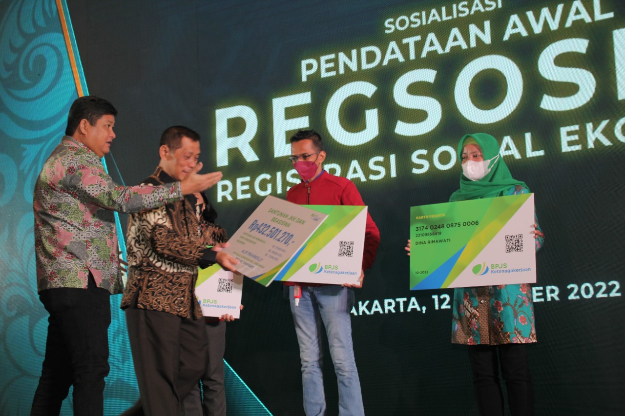 Sebagai tanda telah menjadi peserta, Sekretaris Utama Badan Pusat Statistik (BPS) Atqo Mardiyanto bersama Direktur Kepesertaan BPJS Ketenagakerjaan (BPJAMSOSTEK) Zainudin, secara simbolis menyerahkan kartu kepesertaan kepada 3 petugas Regsosek dan juga seorang ahli waris dari petugas yang meninggal dunia karena kecelakaan kerja, di sela-sela kegiatan sosialisasi pendataan awal Regsosek Tahun 2022 di Hotel Le Meridien Jakarta, Rabu (12/10).