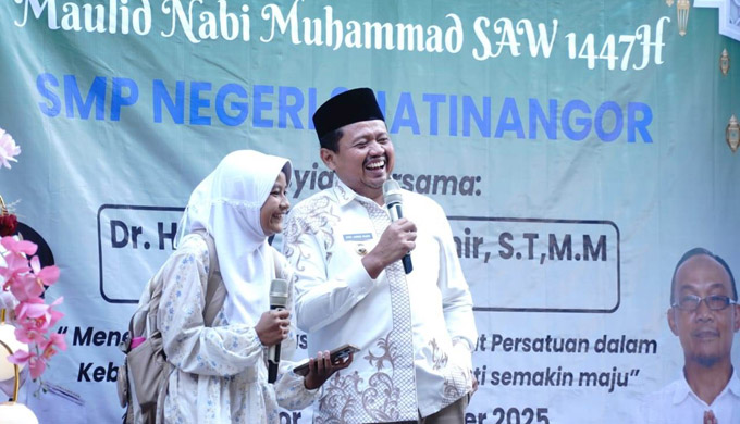 “Anak-anak tidak boleh membawa motor ke sekolah karena belum punya SIM. Membawa motor ke sekolah melanggar. Pak kepala sekolah tolong tegas, tidak boleh anak-anak ini bawa motor ke sekolah,” pinta Dony Ahmad Munir saat memberikan Tausiyah Maulid Nabi Muhammad  1447 H di hadapan pelajar dan guru SMPN 2 Jatinangor, Kamis (4/9/2025).