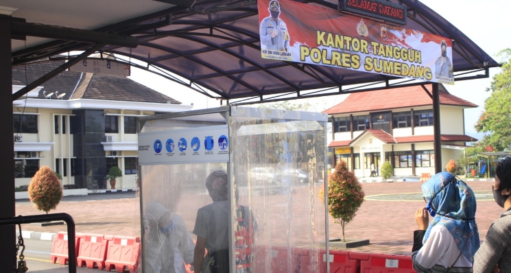 Dalam kegiatan Kantor Tangguh Polres Sumedang setiap anggota Polres Sumedang dan masyarakat yang masuk ke Polres Sumedang dilakukan tes suhu tubuh dan penyemprotan cairan sanitizer.