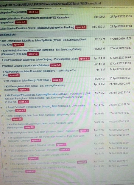 BANDUNG, elJabar.com – Ditengah kegentingan dalam upaya penanganan penularan covid-19, Pemprov Jawa barat melalui LPSE masih melakukan lelang banyak proyek infrastruktur gedung dan jalan, yang bernilai puluhan milyar.
