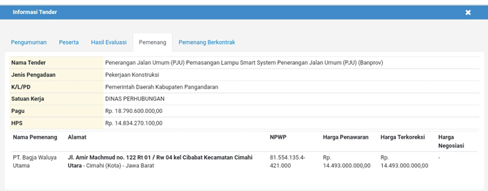 Berdasarkan informasi awal dari situs Layanan Pengadaan Secara Elektronik (LPSE) Kab. Pangandaran, pemenang tender proyek senilai Rp. 14.834.270.100 sumber anggaran Bankeu 2022, yang beralamat di Jln. Amir Machmud no 122 rt 01/ Rw 04 Cibabat Kecamatan Cimahi utara. Alamat tersebut tidak ditemukan, diduga kuat alamat tersebut fiktif alias alamat palsu.