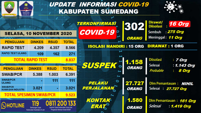 SUMEDANG, eljabar.com — Tim Gugus Tugas Percepatan Penanganan COVID-19 Kabupaten Sumedang kembali melaporkan perkembangan pencegahan penyebaran COVID-19 di Kabupaten Sumedang pada Selasa, 10 November 2020 yang masih perlu lebih diwaspadai.