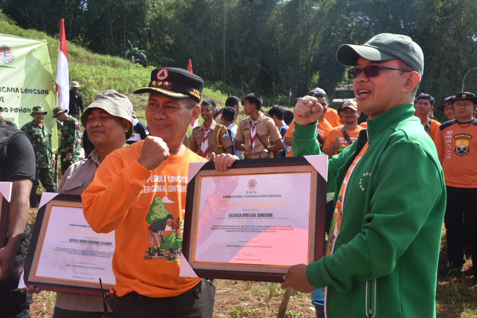 Sumedang, eljabar. Com — Dalam rangka membangun kesadaran masyarakat akan bencana, Badan Nasional Penanggulangan Bencana (BNPB) bersama Badan Penanggulangan Bencana Daerah (BPBD) Kabupaten Sumedang menggelar Gerakan Penanaman 1000 Pohon di lokasi terjadinya longsor dua tahun lalu, yakni di Desa Cihanjuang, Kecamatan Cimanggung.