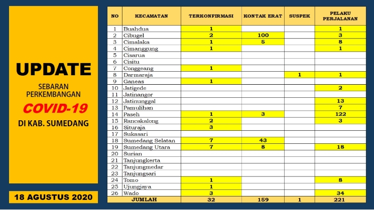 SUMEDANG, eljabar.com — Tim Gugus Tugas Percepatan Penanganan COVID-19 Kabupaten Sumedang kembali melaporkan perkembangan pencegahan penyebaran COVID-19 di Kabupaten Sumedang pada Selasa, 18 Agustus 2020 yang masih perlu lebih diwaspadai.