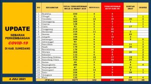 Sumedang, eljabar. Com — Perkembangan terkait situasi dan kondisi penyebaran Covid-19 di Kabupaten Sumedang pada hari ini Minggu tanggal 4 Juli 2021 Pukul 16.00 WIB masih perlu
