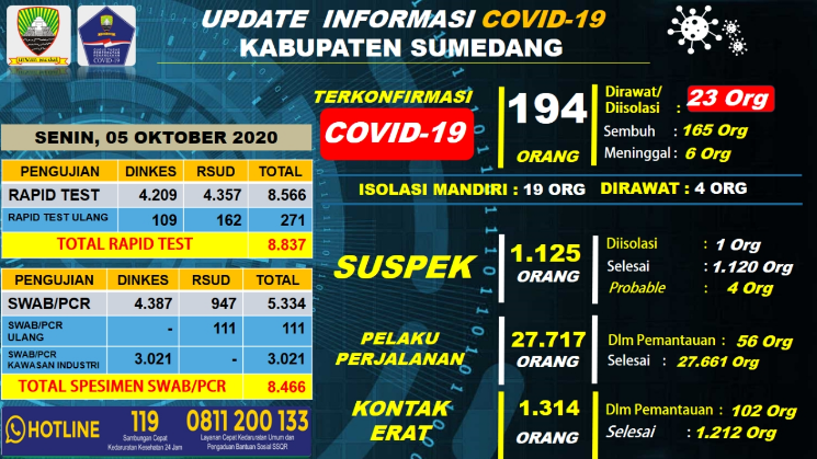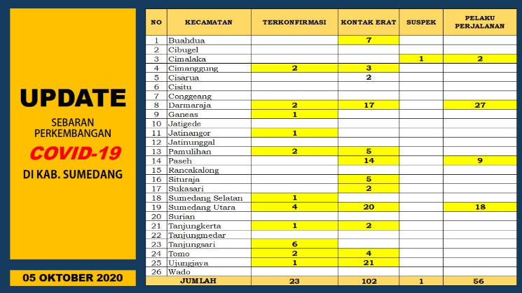 SUMEDANG, eljabar.com — Tim Gugus Tugas Percepatan Penanganan COVID-19 Kabupaten Sumedang kembali melaporkan perkembangan pencegahan penyebaran COVID-19 di Kabupaten Sumedang pada Senin, 5 Oktober 2020 yang masih perlu lebih diwaspadai.