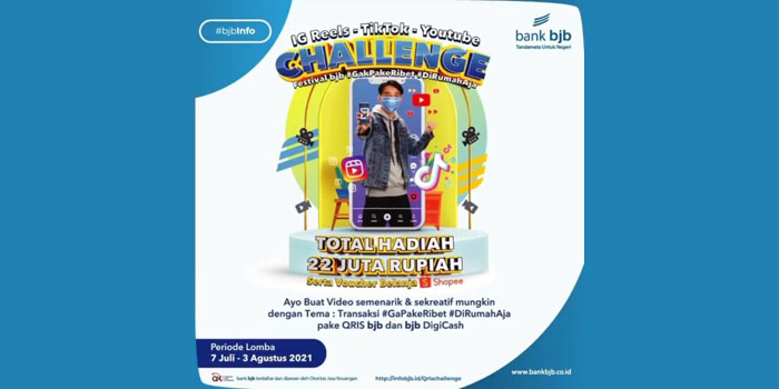 Syaratnya mudah, Anda dapat mengunggah video kreatif Anda ke tiga platform tersebut dengan tema “Transaksi #GakPakeRibet #DiRumahAja pakai QRIS bjb dan bjb DigiCash”. Video menggambarkan kemudahan bertransaksi secara digital tanpa harus beranjak dari rumah menggunakan QRIS bjb dan bjb DigiCash dalam durasi maksimal lima menit. Video yang diunggah harus disertai tagar #bankbjb #QRISbjb #QRISbjbChallenge #bjbDigiCash #bjbDIGI. Juga mention akun Instagram atau Youtube bank bjb.