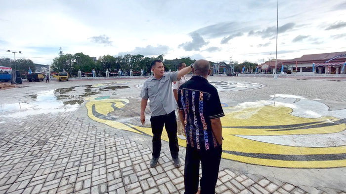 Bernhard didampingi Kepala Bagian Protokol Pemerintah Kota Sorong, Hamza meninjau setiap detail persiapan di Lapangan Upacara Kompleks Kantor Wali Kota Sorong.