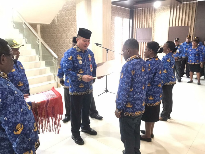 MAYBRAT,- Pj. Bupati Maybrat, Bernhard E. Rondonuwu menyerahkan SK Plt Kepala Bidang Informasi dan Komunikasi Publik pada Dinas Kominfo Kabupaten Maybrat dan SK PNS di lingkungan Pemerintah Kab Maybrat, Rabu (17/5/2023).