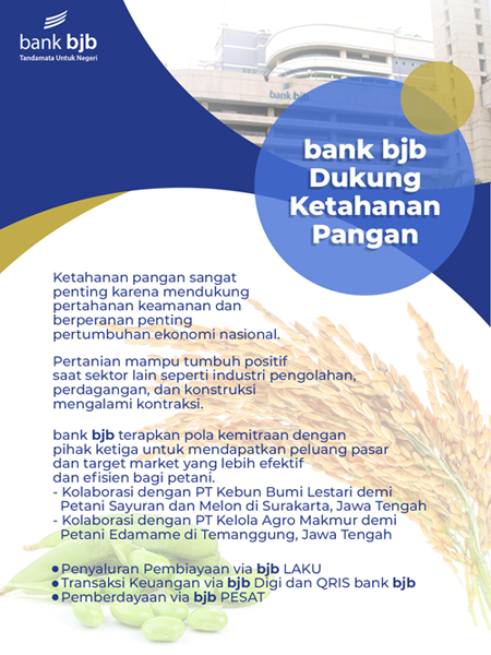Demi memperkuat ketahanan pangan, bank bjb melalui kolaborasi dengan PT Kebun Bumi Lestari yang bergerak di bidang usaha agroindustri pertanian di wilayah Surakarta, Jawa Tengah melalui penyaluran Kredit Usaha Rakyat (KUR) kepada UMKM dan petani Sayuran serta Melon mitra binaan.