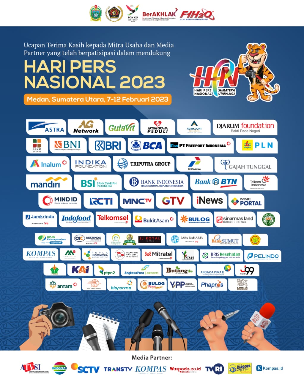 Berikut ini daftar mitra sponsor yang telah mendukung dan partisipasi dalam rangkaian acara Hari Pers Nasional 2023 Sumatera Utara: