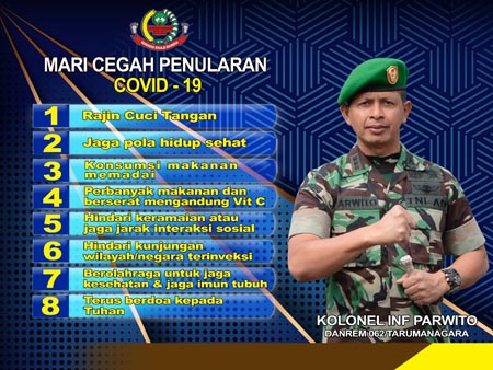 Sejauh ini Danrem 062/Tn menyampaikan terima kasih dan apresiasi terhadap langkah nyata yang dilakukan satuan jajarannya. Seperti Yonif Raider 301/PKS dan Kodim jajaran yang sejauh ini sudah melakukan sinergitas dengan pemerintahan daerah, membentuk Gugus Tugas Tanggap Darurat Pencegahan Penyebaran Virus Corona.