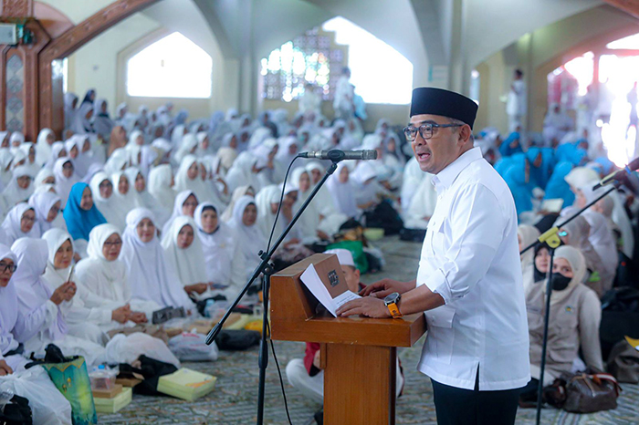 Wali Kota Bandung, Muhammad Farhan, secara langsung memberikan sambutan sekaligus melepas keberangkatan ribuan jemaah menuju Tanah Suci.