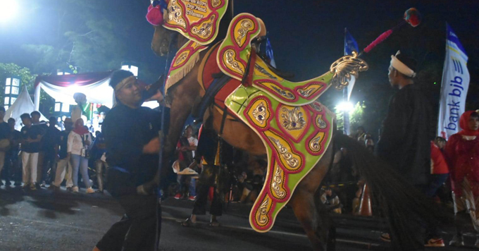 SUMEDANG, elJabar.com — Pelajar SMPN 5 Sumedang, Maulana Cakra Juniar yang mendapatkan hadiah kuda dari Gubernur Jawa Barat Dedi Mulyadi ikut meramaikan pawai lampion dalam rangka memperingati HUT ke-80 RI di Alun-alun Sumedang, Jumat (15/08/2025).