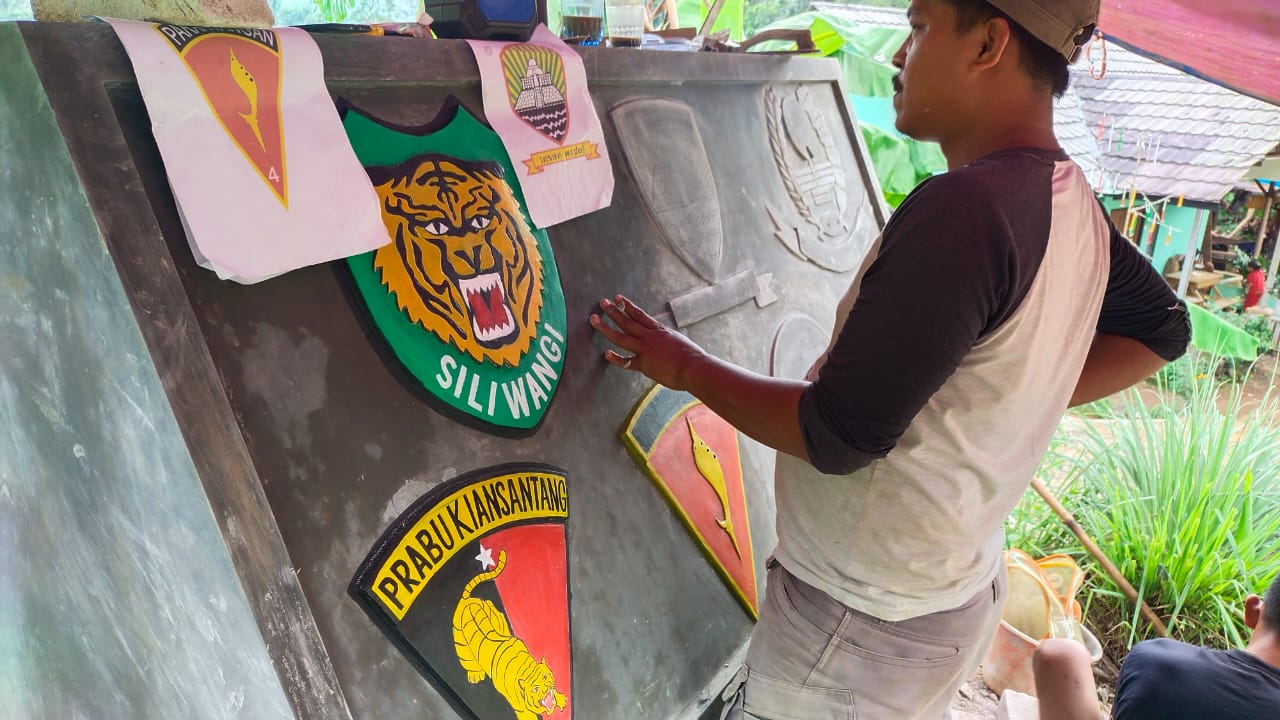 Komar warga Dusun gunung kula desa kertamukti melaksanakan pembuatan gambar gambar satuan di tembok tugu TMMD dengan sukarela,komar memiliki keahlian dibidang melukis dan membuat patung dari tembok gambar mulai nampak ditugu menandakan tidak lama lagi proses pembngunan akan cepat selesai dan hasilnya akan bisa langsung dirasakan.