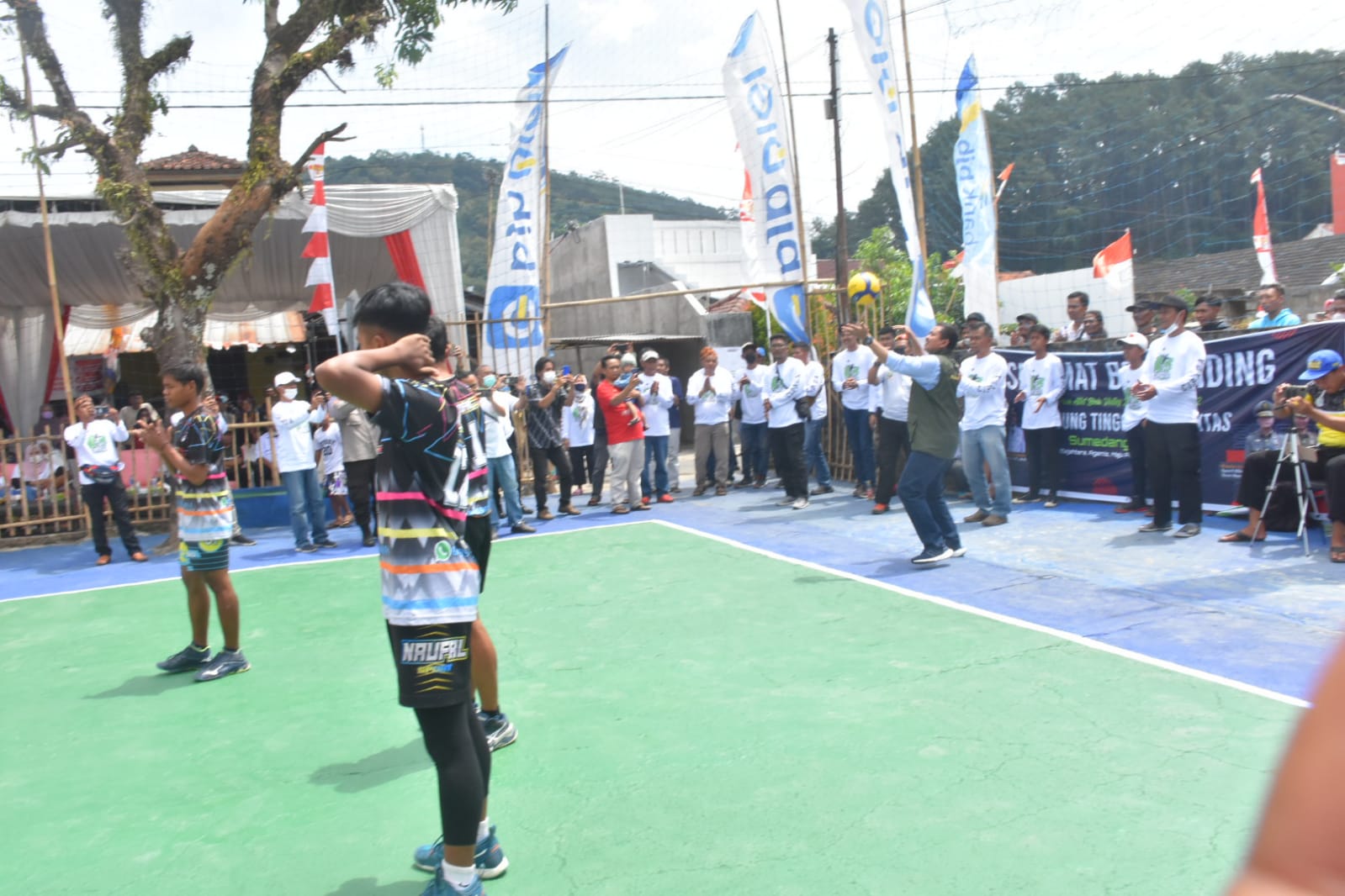 Sumedang, eljabar. Com — Pukulan servis pertama oleh Bupati Sumedang H Dony Ahmad Munir menandai dibukanya Open Tournament Bola Voli Bupati Cup Tahun 2022, Sabtu (27/8), di Lapang Bola Voli Cipada Kelurahan Kota Kulon.
