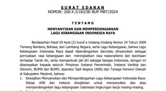 MAYBRAT, eljabar.com — Pemerintah Daerah Kabupaten Maybrat mengeluarkan surat edaran bupati dengan NOMOR: 200.4.3/183/SE-BUP-MBT/2024 yang menginstruksikan menyanyikan dan memperdengarkan lagu…