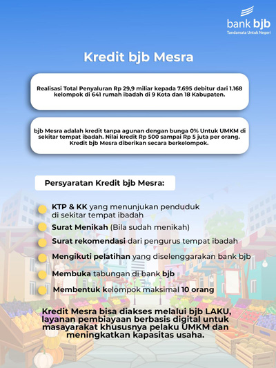 Kredit bjb Mesra merupakan program bersama antara Pemerintah Provinsi Jawa Barat bersama bank bjb. Mesra (Masyarakat Ekonomi Sejahtera) merupakan kredit tanpa agunan dan bebas biaya provisi untuk pelaku usaha mikro.