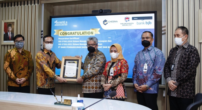 Tahun ini, bank bjb dinyatakan telah menerapkan standar ISO 37001:2016 Sistem Manajemen Anti Penyuapan (SMAP) dan ISO 37301:2021 Sistem Manajemen Kepatuhan (SMK) oleh Lembaga Sertifikasi PT Chesna dan telah diterbitkan sertifikat ISO 37001:2016 SMAP dan ISO 37301:2021 SMK yang berlaku sejak tanggal 22 November 2021 sampai dengan 22 November 2024 pada ruang lingkup area/aktivitas pengajuan dan pencairan kredit korporasi dan komersial. Selanjutnya penerapannya akan dilakukan pada ruang lingkup area/ aktivitas yang lebih luas.