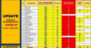 Sumedang,eljabar.com — Perkembangan terkait situasi dan kondisi penyebaran Covid-19 di Kabupaten Sumedang pada hari ini Jumat tanggal 20 Agustus 2021 Pukul 16.00 WIB masih perlu diwaspadai.