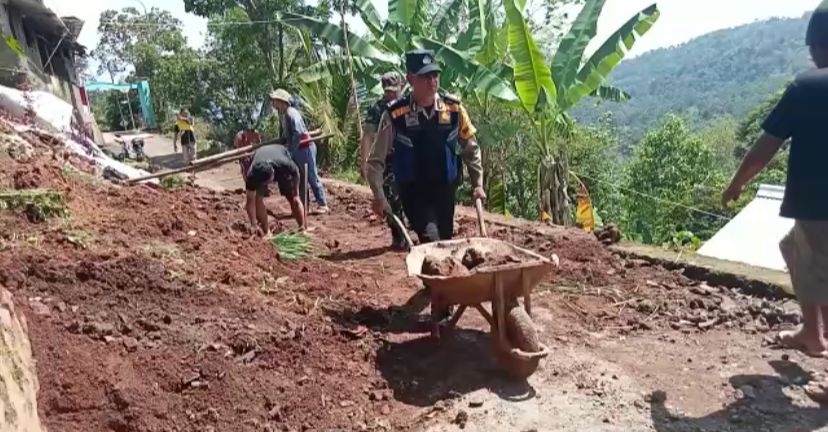 Petugas Kepolisian Bahu Membahu Bersama Warga Bersihkan Longsoran di Wilayah Ganeas Sumedang