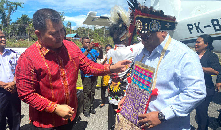 Secara simbolis Gubernur dan Walikota dikalungi noken oleh Pj. Bupati Maybrat untuk selanjutnya mengikuti Misa Peresmian Gereja St. Yoseph di Ayawasi. (Abas)