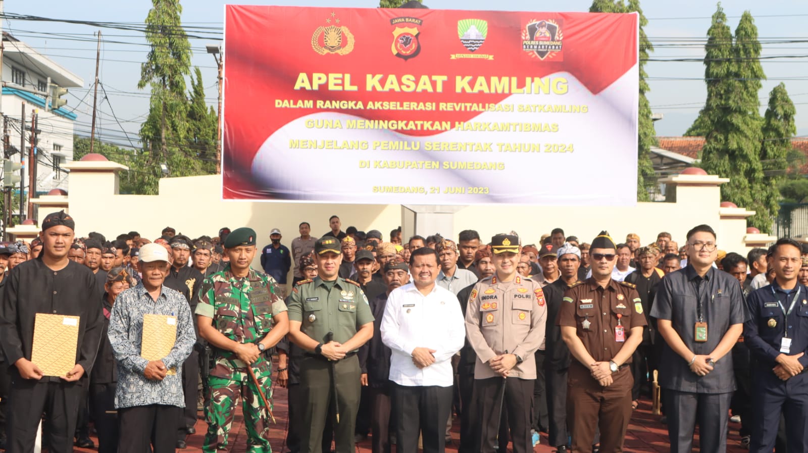 Apel ini dihadiri oleh Kapolres Sumedang AKBP Indra Setiawan, Bupati Sumedang Donny Ahmad Munir, Danmin 0610 Sumedang Letkol Inf Hendrix Fahlevi Rangkuti, pejabat utama Polres Sumedang, serta peserta apel Satkamling yang terdiri dari masyarakat dan perwakilan ormas se-Kabupaten Sumedang.