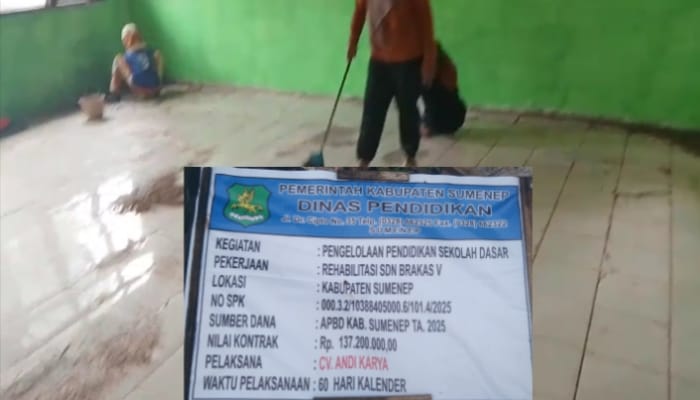 Berdasarkan papan informasi proyek, kegiatan rehabilitasi tersebut berada di bawah naungan **Dinas Pendidikan Kabupaten Sumenep, dengan nilai kontrak mencapai Rp137.200.000 yang bersumber dari APBD Kabupaten Sumenep Tahun Anggaran 2025. Waktu pelaksanaan ditetapkan selama 60 hari kalender. Namun, fakta di lapangan menunjukkan hasil yang jauh dari kata rapi.