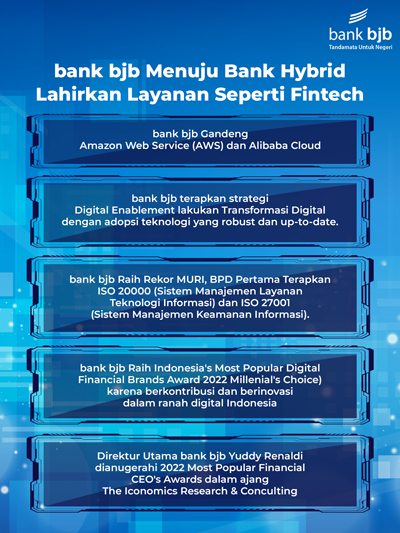 bank bjb meraih penghargaan 3rd Indonesia’s Most Popular Digital Financial Brands Award 2022 (Millenial’s Choice) karena berkontribusi dan berinovasi dalam ranah digital Indonesia, dan kepada Direktur Utama bank bjb Yuddy Renaldi dianugerahi 2022 Most Popular Financial CEO’s Awards dalam ajang The Iconomics Research & Conculting, yang diselenggarakan secara hybrid (offline & online) pada Kamis 24 Februari 2022.