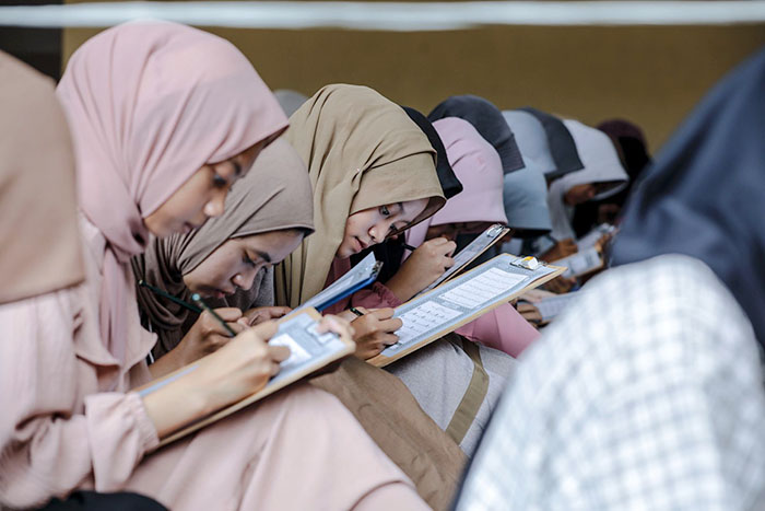 Ratusan siswa kelas X tampak menuliskan wahyu Allah SWT dengan tenang dan penuh ketekunan. Beberapa siswa mampu menyelesaikan tiga halaman, lainnya memilih lebih hati-hati dan teliti memastikan goresan pensilnya sesuai dengan lafal yang harus ditebalkan.