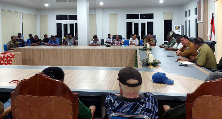MAYBRAT, eljabar.com — Pj. Bupati Maybrat, Bernhard E. Rondonuwu bersama para tokoh Aifat Raya dan tokoh Mare Raya terkait tuntutan penundaan penyerahan DIPA tahun anggaran 2023 dan penggantian Kepala OPD lama dan melantik Kepala OPD yang baru, Senin (20/2/2023).