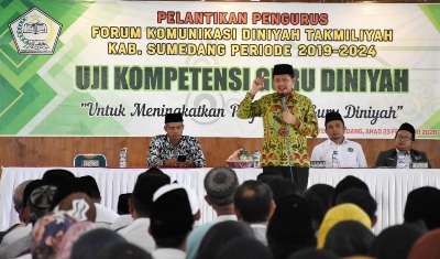 Acara Uji Kompetensi Guru Diniyah Takmiliyah (UKG.DT) dirangkaikan dengan pengukuhan pengurus FKDT Kabupaten Sumedang periode 2019-2024 sekaligus penyerahan sertifikat guru diniyah takmiliyah yang secara simbolis diserahkan oleh Bupati Sumedang H. Dony Ahmad Munir kepada 2 perwakilan orang guru diniyah takmiliyah.
