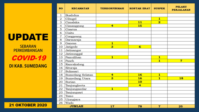 SUMEDANG, eljabar.com — Tim Gugus Tugas Percepatan Penanganan COVID-19 Kabupaten Sumedang kembali melaporkan perkembangan pencegahan penyebaran COVID-19 di Kabupaten Sumedang pada Rabu, 21 Oktober 2020 yang masih perlu lebih diwaspadai.