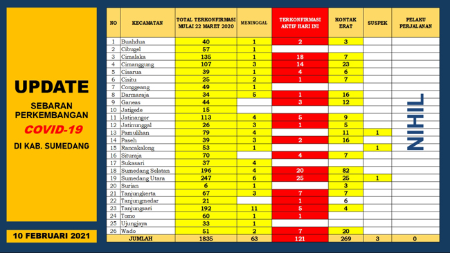 SUMEDANG, eljabar.com — Tim Gugus Tugas Percepatan Penanganan COVID-19 Kabupaten Sumedang kembali melaporkan perkembangan pencegahan penyebaran COVID-19 di Kabupaten Sumedang pada Rabu, 10 Februari 2021 yang masih perlu lebih diwaspadai.