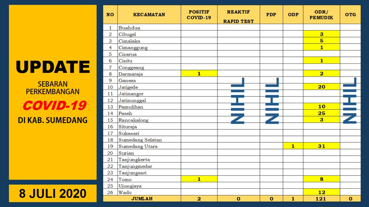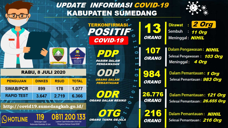 SUMEDANG, eljabar.com — Gugus Tugas Percepatan Penanganan COVID-19 Kabupaten Sumedang kembali melaporkan perkembangan pencegahan penyebaran COVID-19 di Kabupaten Sumedang pada Rabu, 8 Juli 2020 yang masih perlu lebih diwaspadai.