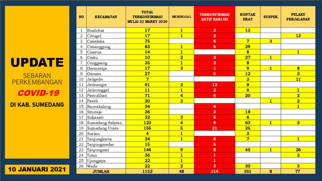 SUMEDANG, eljabar.com — Tim Gugus Tugas Percepatan Penanganan COVID-19 Kabupaten Sumedang kembali melaporkan perkembangan pencegahan penyebaran COVID-19 di Kabupaten Sumedang pada Minggu, 10 Januari 2021 yang masih perlu lebih diwaspadai.