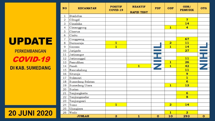 SUMEDANG, eljabar.com — Gugus Tugas Percepatan Penanganan COVID-19 Kabupaten Sumedang kembali melaporkan perkembangan pencegahan penyebaran COVID-19 di Kabupaten Sumedang pada Sabtu, 20 Juni 2020 yang masih perlu lebih diwaspadai.