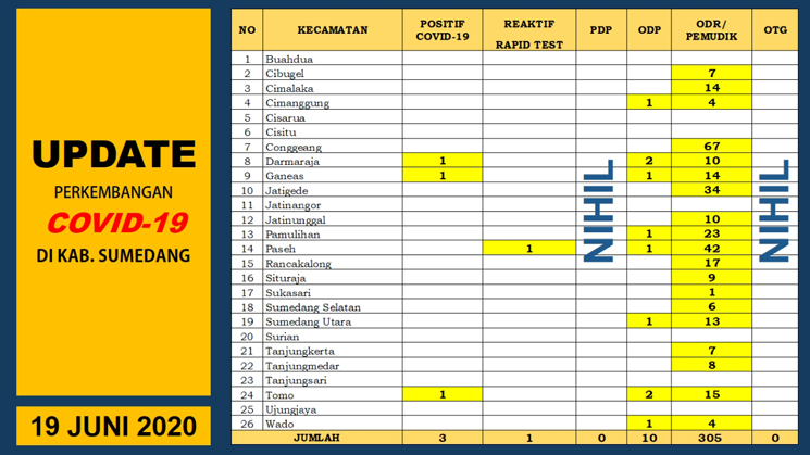 SUMEDANG, eljabar.com — Gugus Tugas Percepatan Penanganan COVID-19 Kabupaten Sumedang kembali melaporkan perkembangan pencegahan penyebaran COVID-19 di Kabupaten Sumedang pada Jumat, 19 Juni 2020 yang masih perlu lebih diwaspadai.