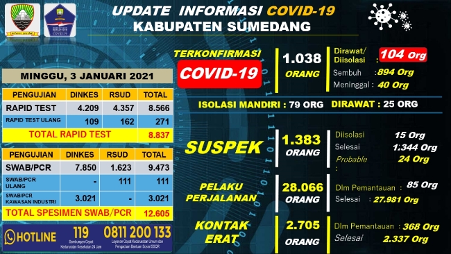 SUMEDANG, eljabar.com — Tim Gugus Tugas Percepatan Penanganan COVID-19 Kabupaten Sumedang kembali melaporkan perkembangan pencegahan penyebaran COVID-19 di Kabupaten Sumedang pada Minggu, 3 Januari 2021 yang masih perlu lebih diwaspadai.