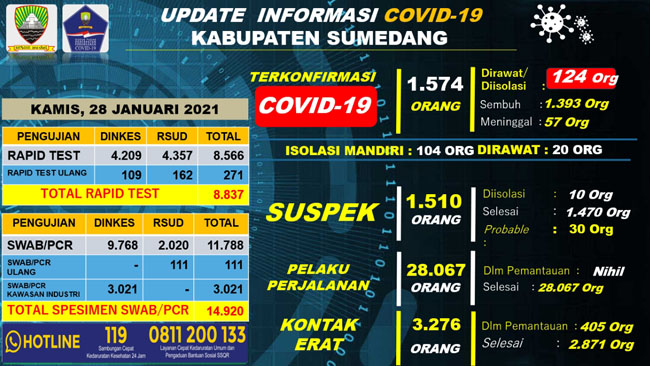 SUMEDANG, eljabar.com — Tim Gugus Tugas Percepatan Penanganan COVID-19 Kabupaten Sumedang kembali melaporkan perkembangan pencegahan penyebaran COVID-19 di Kabupaten Sumedang pada Kamis, 28 Januari 2021 yang masih perlu lebih diwaspadai.