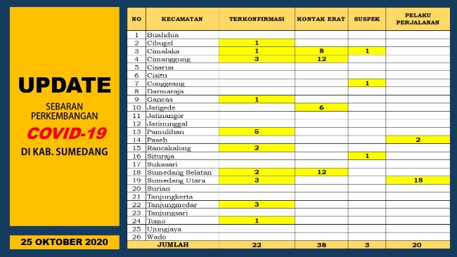 SUMEDANG, eljabar.com — Tim Gugus Tugas Percepatan Penanganan COVID-19 Kabupaten Sumedang kembali melaporkan perkembangan pencegahan penyebaran COVID-19 di Kabupaten Sumedang pada Minggu, 25 Oktober 2020 yang masih perlu lebih diwaspadai.