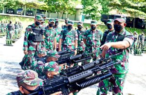 Kemudian dilanjutkan pengecekan dengan gelar pasukan meliputi kesiapan personel maupun materiil berlangsung, di Lapangan Yonif Raider 301/PKS.