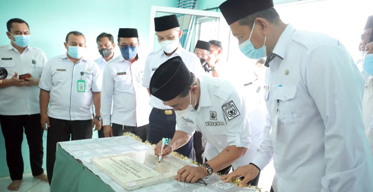 Peresmian ditandai dengan pengguntingan pita dan penandatangaan prasasti oleh Bupati didampingi Kepala Dinas Sosial Basuni.